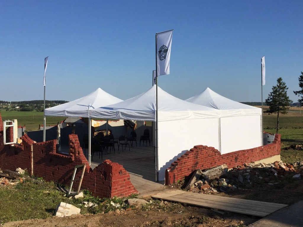 Организация торжественных мероприятий на природе позволяет сделать их незабываемыми. Помолвка, регистрация брака, юбилей, детский праздник в лесу, парке или на берегу водоёма надолго останутся в памяти гостей. Прокат белого шатра снизит риск срыва торжества из-за погодных условий. Он защитит гостей от порывов ветра, солнечных лучей, или небольшого дождя. Нейтрально белый цвет шатра подчёркивает торжественность происходящего и хорошо смотрится на фоне зелени.
